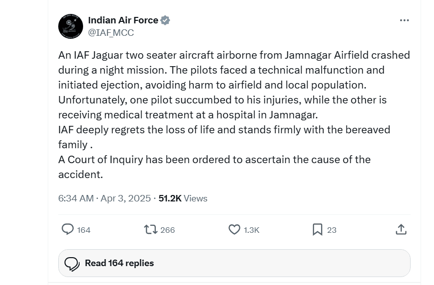 New Delhi, April 3, 2025— In a heartbreaking incident, an Indian Air Force (IAF) pilot lost his life after a Jaguar fighter jet crashed during a night training mission in Gujarat’s Jamnagar. The twin-seater aircraft went down in Suvarda village, located around 12 kilometers from Jamnagar city. The other pilot, who was also onboard, sustained injuries and is currently undergoing treatment at a hospital.
